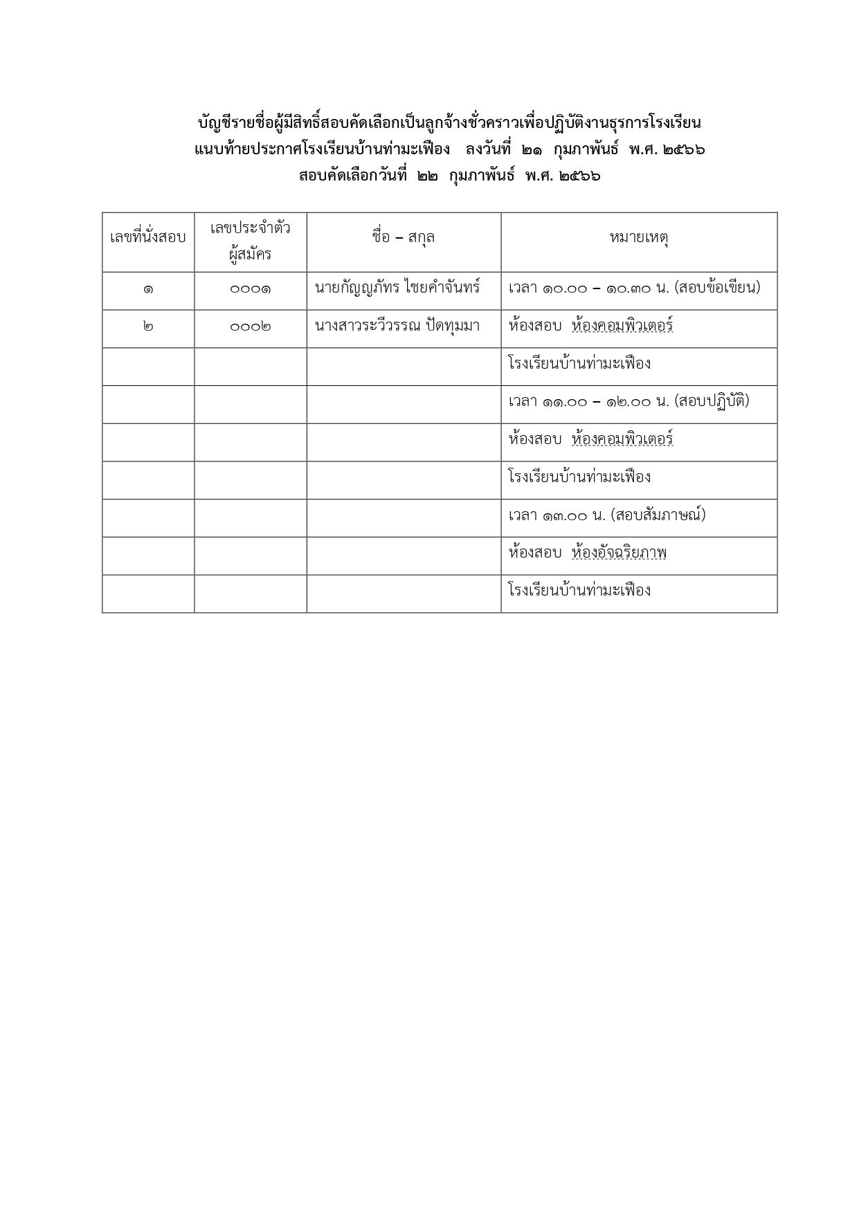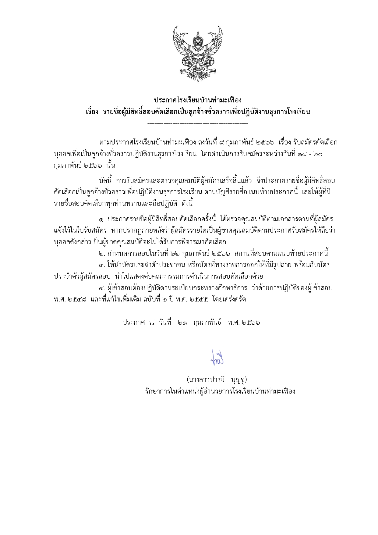 ประกาศรายชื่อผู้มีสิทธิ์สอบคัดเลือกเป็นลูกจ้างชั่วคราวเพื่อปฏิบัติงานธุรการโรงเรียน