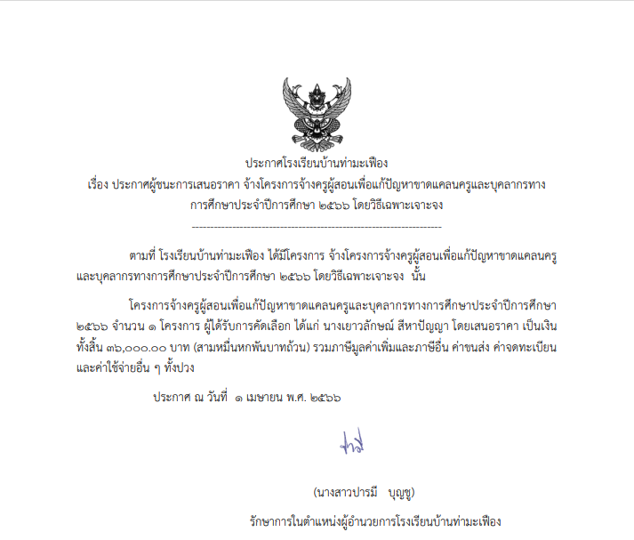 ประกาศผู้ชนะการเสนอราคา จ้างโครงการจ้างครูผู้สอนเพื่อแก้ปัญหาขาดแคลนครูและบุคลากรทาง การศึกษาประจำปีการศึกษา ๒๕๖๖ โดยวิธีเฉพาะเจาะจง