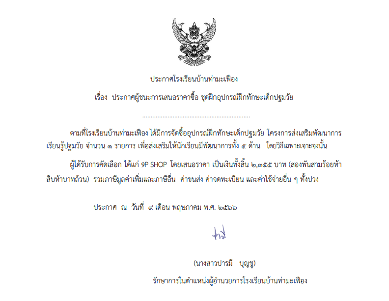 ประกาศผู้ชนะการเสนอราคาซื้อ ชุดฝึกอุปกรณ์ฝึกทักษะเด็กปฐมวัย
