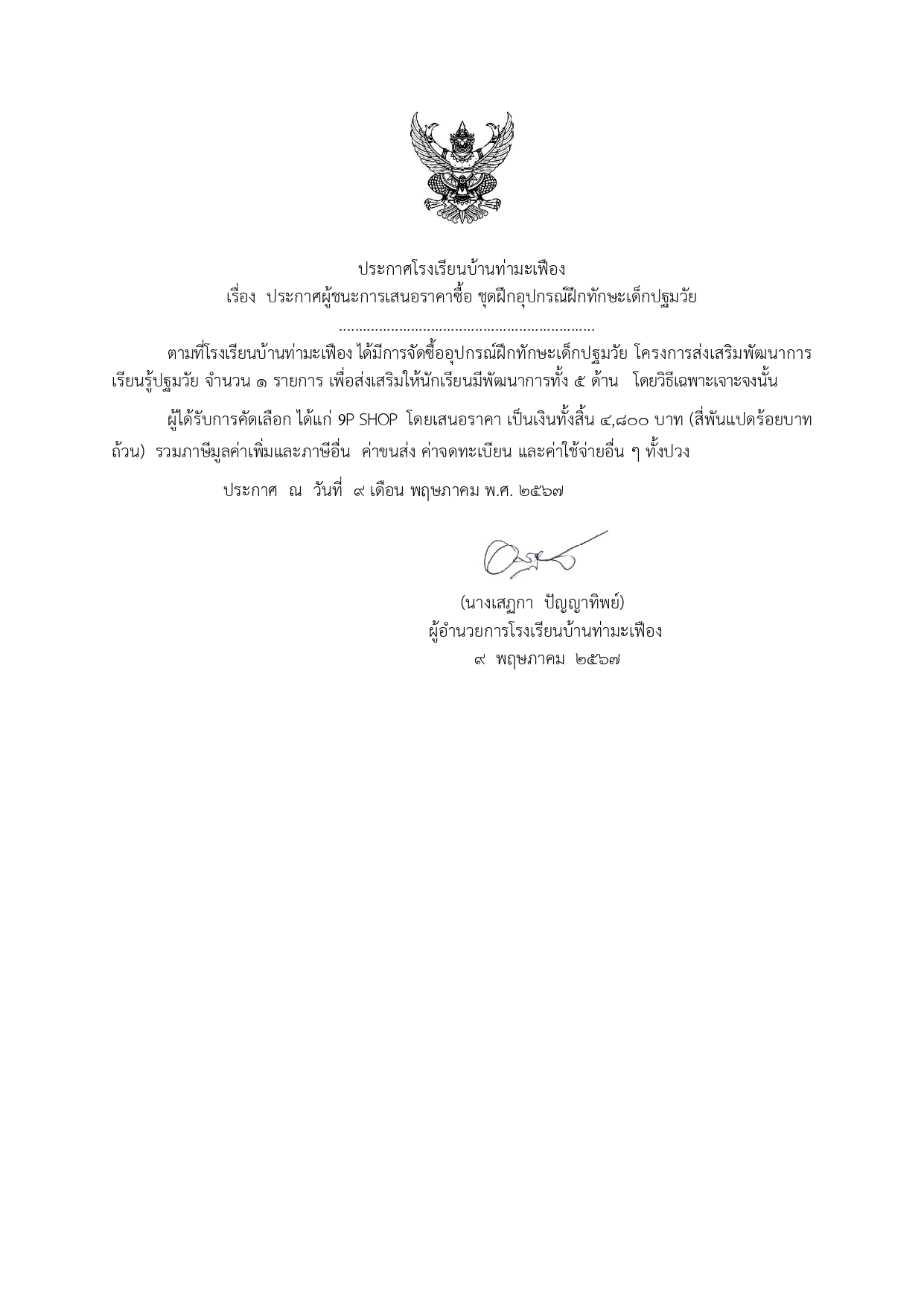 ประกาศผู้ชนะการเสนอราคาซื้อ ชุดฝึกอุปกรณ์ฝึกทักษะเด็กปฐมวัย