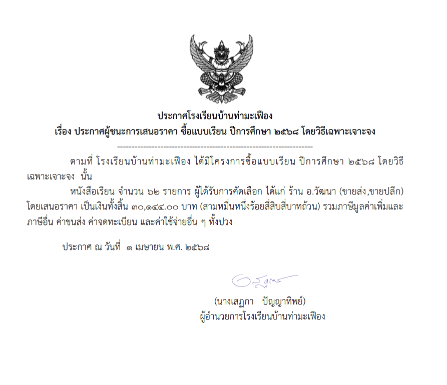 ประกาศผู้ชนะการเสนอราคา ซื้อแบบเรียน ปีการศึกษา ๒๕๖๘